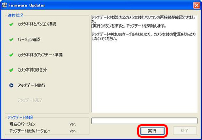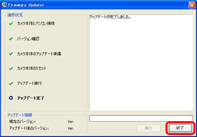 - 「現在のバージョン」が、「Ver.1.01」になっている場合はアップデートする必要がありません。メッセージに従ってUSB接続を解除して「終了」をクリックします。