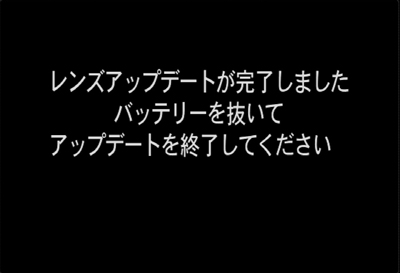 - 1.カメラに「レンズアップデートが完了しました。バッテリーを抜いてアップデートを終了してください。」と表示されたら、アップデート作業は完了です。QXシリーズのカメラをお使いの場合は、液晶パネルの表示が消えたらアップデート作業は完了です。