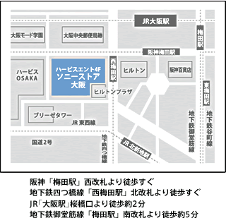 阪神「梅田駅」西改札より徒歩すぐ/地下鉄四つ橋線「西梅田駅」北改札より徒歩すぐ/JR「大阪駅」桜橋口より徒歩約2分/地下鉄御堂筋線「梅田駅」南改札より徒歩約5分