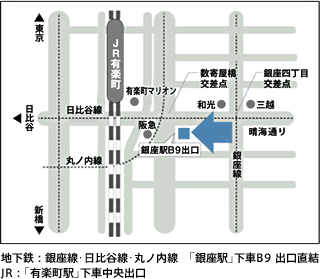 地下鉄:銀座線・日比谷線・丸ノ内線 「銀座駅」下車B9 出口直結/JR:「有楽町駅」下車中央出口