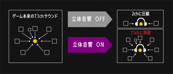 PCソフトウェア「INZONE Hub」で立体音響設定を有効にすることで、通常2chに圧縮されるゲームの音声信号をゲーム本来の7.1chサウンドに再現。ゲーム向けに最適化されたソニーの360立体音響技術によって、優れた音の定位感や解像度を実現し、ゲームの世界に入り込んだかのような没入体験や、音によって相手を正確に察知できることによる勝利体験をプレイヤーにもたらします。
