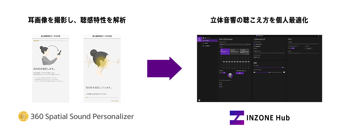 スマートフォンアプリ「Sony 360 Spatial Sound Personalizer」で自分の耳画像を撮影し、PCソフトウェア「INZONE Hub」で設定を行う事で、立体音響の個人最適化が可能。耳や頭の形、大きさによって生まれる音の聴こえ方の個人差を補正し、理想的なゲームサウンドの聴こえ方を再現します。