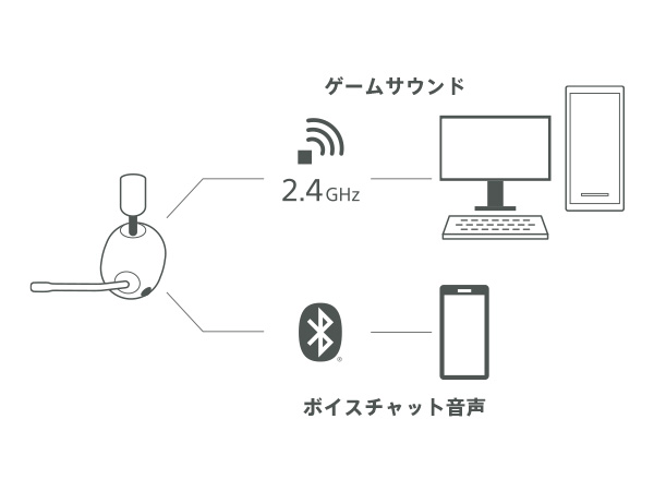 2.4GHzワイヤレス接続でPCと繋ぎながら、スマートフォンとBluetooth接続をすることで、ゲームをしながらスマートフォンの通話アプリを使用したボイスチャットや、日常的な通話が可能です。