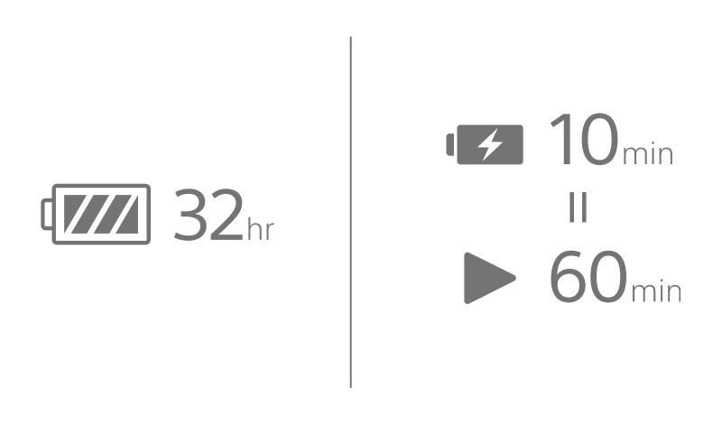 最大32時間(ノイキャンOFF設定時)のロングバッテリーと、10分充電で60分使用可能な急速充電に対応。