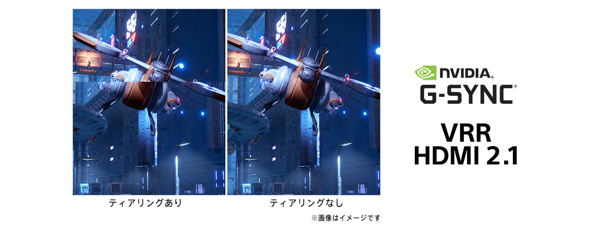 ディスプレイ側で映像に合わせて表示枚数を決める可変リフレッシュレート(VRR)の中でも、NVIDIA(R) G-SYNC(R) CompatibleとVRR(HDMI2.1)の両方に対応。ゲーミングPCでもPlayStation(R)5でも、チラつき(ティアリング)やカクつき(スタッタリング)を軽減します。