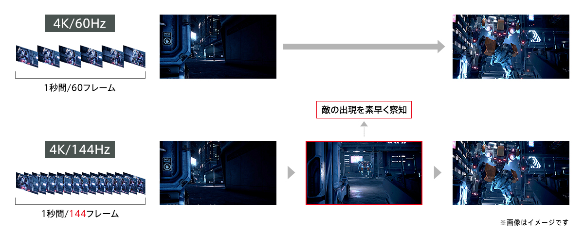 DisplayPortに接続すると、4K解像度でリフレッシュレート144Hzを表示可能。秒間144フレームのスムーズな動きと高精細な映像の両立で、究極の没入体験を実現します。さらに、HDMI接続での4K120Hz表示にも対応。PlayStation(R)5でも究極の没入体験を味わえます。