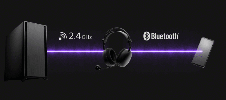 2.4GHzワイヤレス接続で繋いだPCやコンソール機器でゲーム音を聞きながら、同時にBluetooth接続で繋いだスマートフォンで通話が可能です。