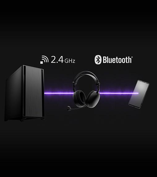 低遅延2.4GHzワイヤレス接続に加え、Bluetooth Classic / LE Audio、3.5mm有線接続と幅広い接続方式に対応しています。また、2.4GHzワイヤレス接続とBluetoothの同時接続が可能です。