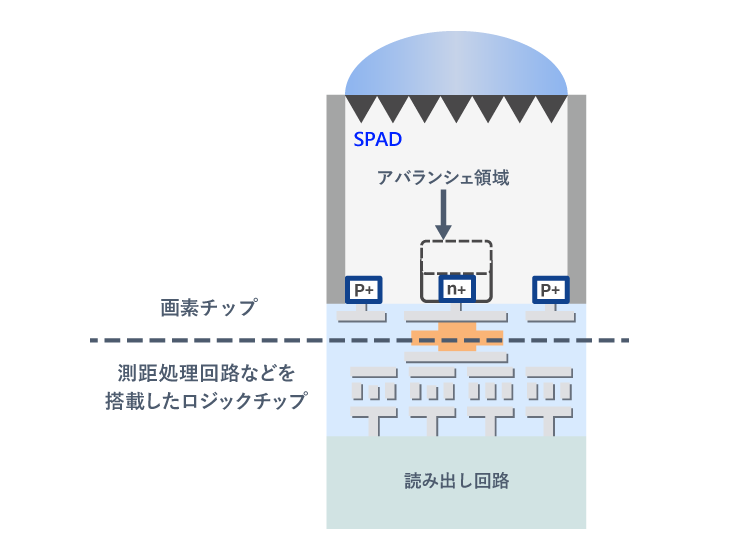 SPADセンサーはSingle Photon Avalanche Diodeの略で、光の最小単位である光子(以下、フォトン)を検出できるほど高感度な光センサーです。フォトンが当たると多くの電子へと増倍(アバランシェ増倍)させることができるため、微弱な光でも瞬時に大きな電気信号へ変換できます。