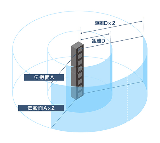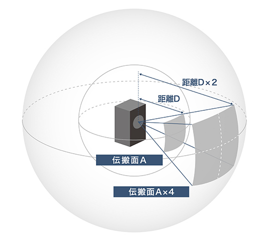 距離が 2 倍になると、伝搬面の表面積は 4 倍に拡がります。