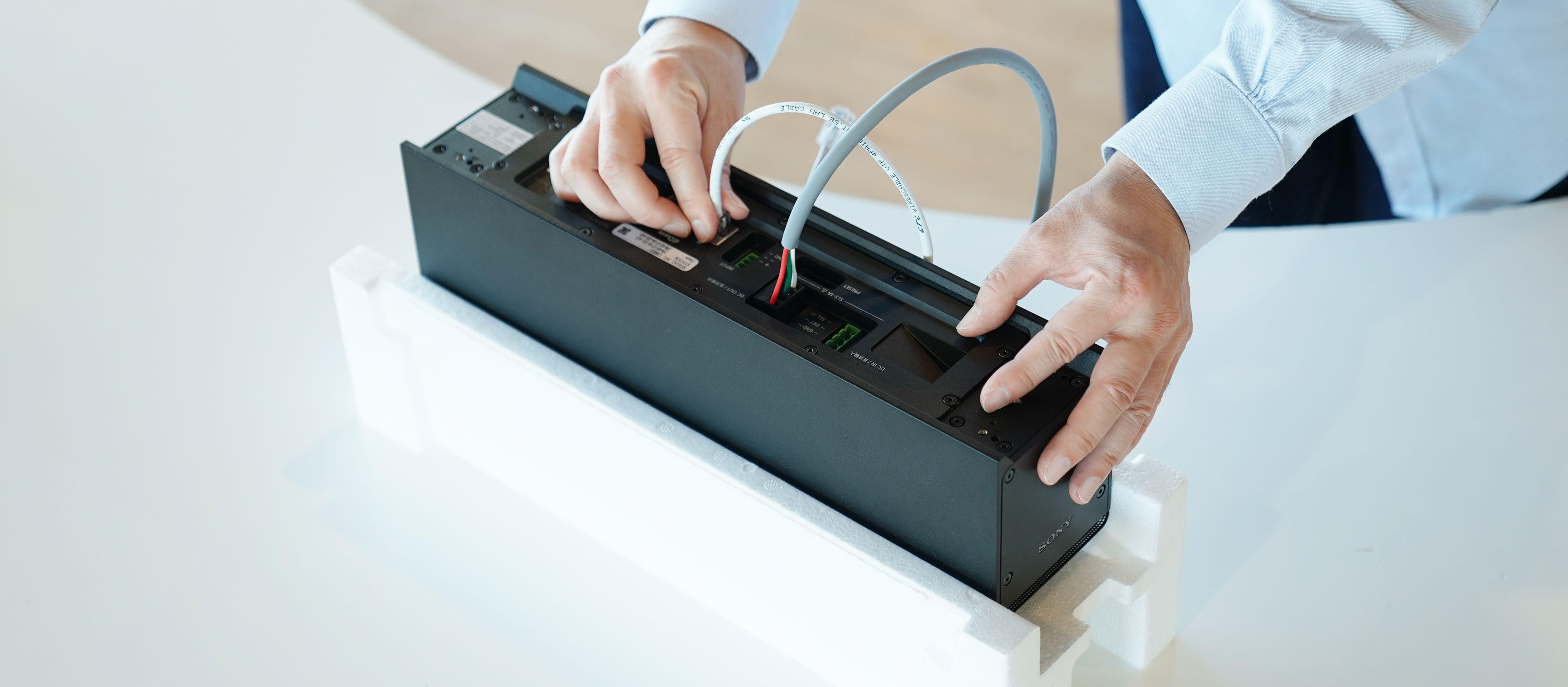 佐々木:Danteは大学設備やスタジオ、放送局などの業務用機器のインターフェースにおいてデファクトスタンダードといってもいいほど浸透しているフォーマットですので、SLS-1Aも幅広いシーンで使用してもらうためにDanteに対応しました。普通、機器を複数台連結したときにはデータの通信速度によって若干の音のズレが生じることがあるのですが、Danteの特長の1つに「時刻同期」があるので、Danteを介して連結した機器を完全に同期させて動かすことができます。複数のSLS-1Aをカスケード接続して1つのスピーカーとして使用するためにも、Danteへの対応は欠かせませんでした。