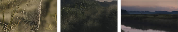 クモの巣の水滴のきらめきや、暗くなった川辺の植物の微妙な緑の変化、撮影時に目視できなかった夕日の赤の成分もしっかりキャプチャーしており、これをグレーディングにより整えていった。