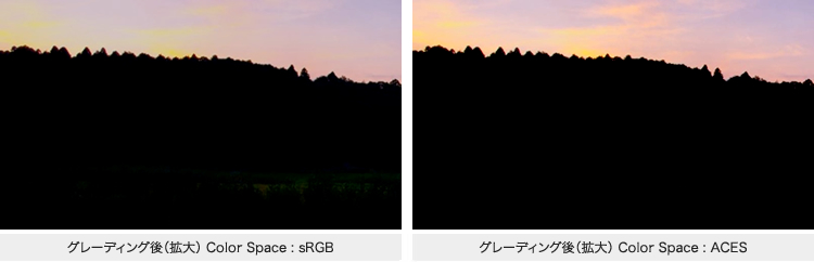 撮影素材は、F65による広色域S-Gamutで撮影。これをsRGB、ACESカラースペースに変換して比較すると、特にハイライトの部分でsRGBで保有できなかったような赤の成分をACESカラースペースで有している事が分かり、更に美しい色表現が可能に。 ※Web上で違いをより分かりやすくする為、少し色合いを強調しています。