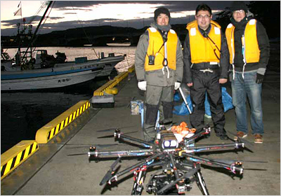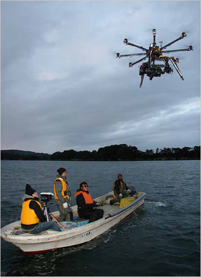 飛行時間などの制約から、安全第一を前提に、カメラの設定はオートアイリス、オートフォーカス、画角は30.0mmのワイド端に固定して撮影しました。機体から無線で送られてくる飛行制御用のコンポジットの画を見ながら、雲台のパン・チルトを遠隔操作しました。メインのPMW-F55がS-Log2を使用しているので、質感をなるべく合わせるためにCinematoneガンマを使用しています。特に、松島海岸の撮影では、飛行時間を有効に活用するため、パイロットとカメラマンが別の小舟に乗って離れた地点から操作しています。事前に綿密なリハーサルや画のイメージの打ち合わせを行って対応しましたが、通常の撮影とは異なる難しさがあったことは事実です。