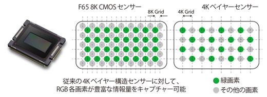 F65RSのCMOSイメージセンサーは、水平画素8K、総画素数約2000万画素(*1)を配置することで、スーパー35mmカメラとして業界最高(*2)の解像度を実現しました。このCMOSイメージセンサーを「F65RS」に搭載することで、よりクオリティーの高い4Kコンテンツ制作を実現しています。