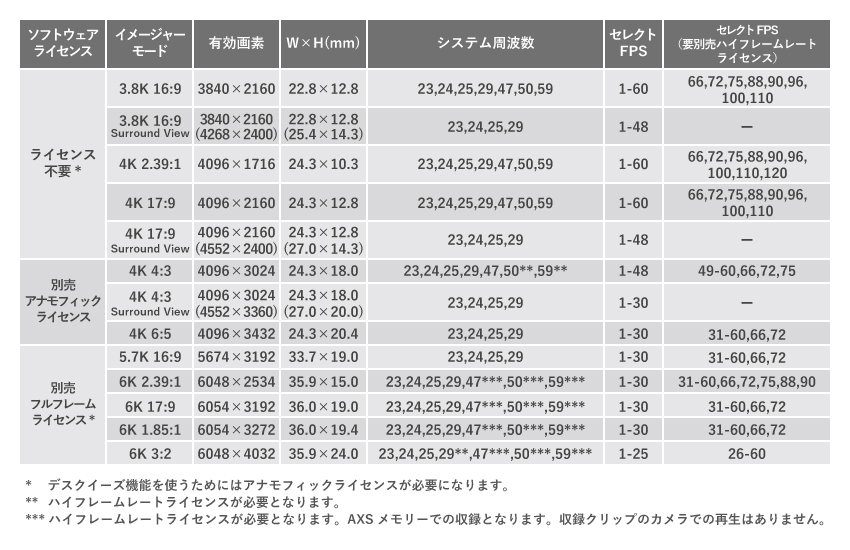 ※ 5.7K、6Kは別売フルフレームライセンスが、4K 4:3、4K 6:5は別売アナモフィックライセンスが必要です