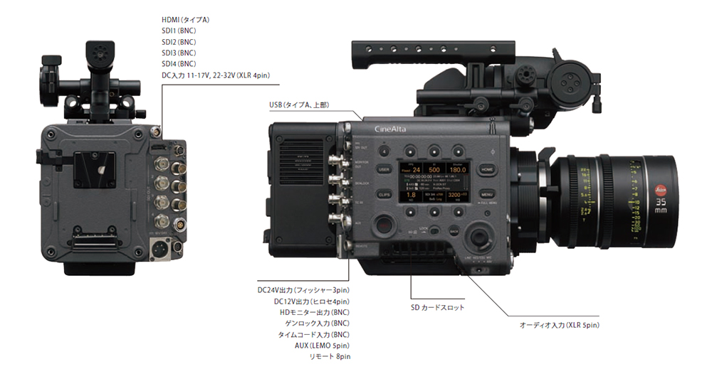 VENICEは、ソニー独自の小型化技術によりフルフレーム大型イメージセンサーを搭載しながらコンパクトな筐体を実現しており、狭いスペースでの撮影やドローン搭載時の利便性を向上させています。操作ボタンは直観的な操作を実現するために場所、形状、サイズを徹底的に検討して配置されており、また暗所撮影を考慮しバックライトを備えています。インターフェースは4K 出力(SDI×4)に加え、HDモニター出力(SDI×1)を備え、オンセットのモニタリング機能が強化されています。電源入出力は12V、24Vのいずれにも対応することができ、DC24V出力はフィッシャーを採用。幅広いアクセサリがサポートされます。ビューファインダー用端子には高い堅牢性を持つLEMOを採用しています。