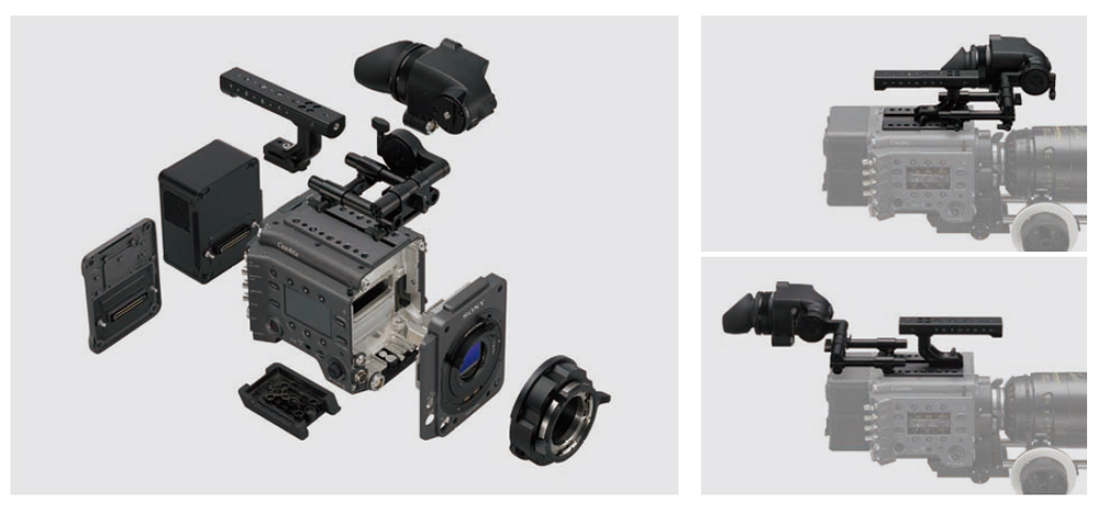 VENICEは完全なモジュラー設計となっており、撮影用途に合わせさまざまなリグや周辺機器との組み合わせに柔軟に対応することができます。レンズとのバランスや使い方に合わせてトップハンドルとビューファインダーは簡単にポジション調整が可能です。光軸高はPMW-F55と同じなのでPMW-F55用の周辺機器を活用することが可能です。後部には別売のポータブルメモリーレコーダーAXS-R7を4本のネジにより強固に固定することができます。