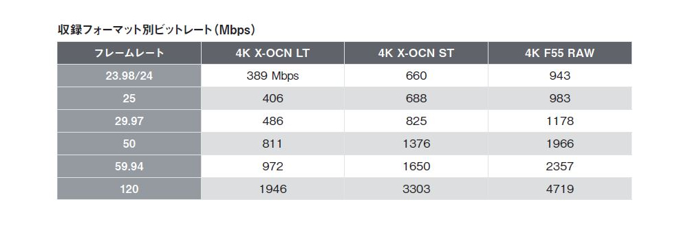 X-OCN STは、F55RAWに迫る高画質を実現しながらも、4K 24p収録時に660Mbpsのデータレートを実現しており、これはF55RAWに対して約30%軽量な記録モードとなります。