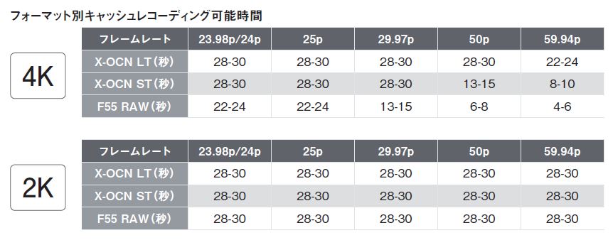 * キャッシュレコーディングは、以下の固定フレームレートでの撮影において有効です。また、同時記録時にはご使用いただけません