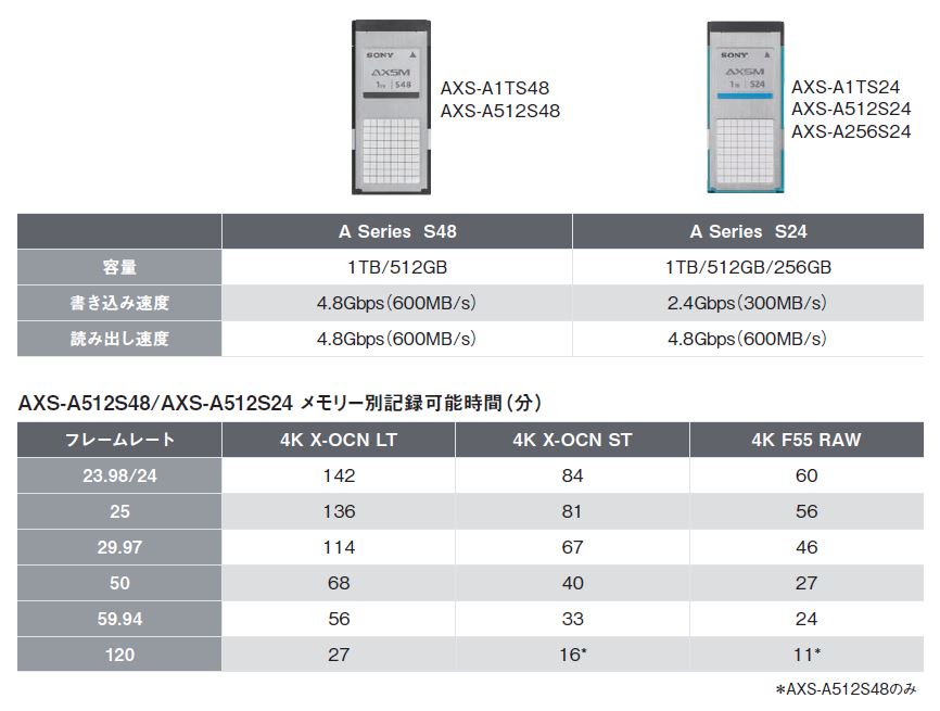 4K RAWおよびX-OCNによる120p記録において十分なパフォーマンスを確保するハイスピードラインアップS48シリーズを新たに追加しています。