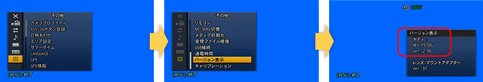 [MENU] → [その他] → [バージョン表示] より、ボディのバージョンが"Ver.2.1"以下または、"Ver.3.10"、"Ver.3.01" となっていることを確認してください。