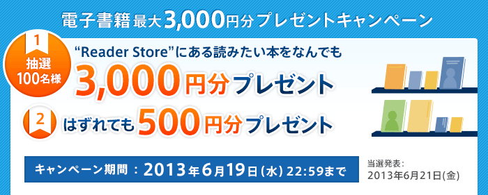 さらに抽選ではずれても、もれなく“Reader Store”で使用できる「電子図書券(NET CASH)500円」をプレゼント!