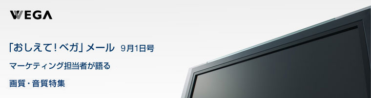ソニーが満を持して発表した新しい<ベガ>を、ちょっとだけお先に体験する機会をいただきました。プラズマと液晶、ずらっとラインアップが並んでいる様子は壮観です。説明してくれたのは、ソニーマーケティング(株)の<ベガ>マーケティング担当、酒井さんと小笠原さんのお二人。まず、新しい<ベガ>の特長から、聞いてみましょう。 鷲頭あや子(以下W) この新しい<ベガ>はどんなことに重点をおいて作られたのでしょうか? 酒井 薄型テレビも普及が進んで、最近では「テレビはインテリアの一部である」というようなうたい文句もあふれています。しかし、ソニーが定めた方向性は、やはり「テレビは画像と音を楽しむもの」ということなのです。テレビ本来の性能、つまり画質の美しさ、音の良さ、そしてテレビの用途が多様化した現在でも快適に使いこなせる機能性、こうした性能を今まで以上に徹底的に追究して結集させた製品が、今度の<ベガ>です。