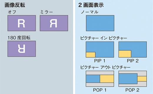 画像の左右反転、180度回転機能を搭載。また、さまざまなパターンの2画面表示機能も搭載しています。