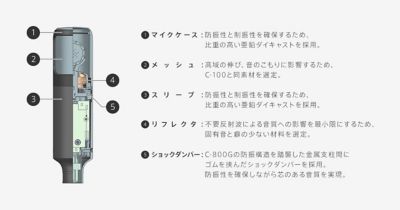 マイクボディにはC-800GとC-100から継承した「防鳴筐(きょう)体構造」を採用し、ボディの鳴きを低減することで濁り音を排除し、クリアな音を実現します。また、屋外からの騒音 、自宅内の機器などから発生する不要な低周波ノイズを抑制する ローカットフィルター、過大な入力音による歪みを最小限に抑えるパッドスイッチ機能も搭載しています。