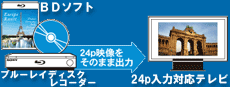 市販のBDソフトは、オリジナルフィルムと同じ毎秒24コマのプログレッシブハイビジョン映像 (24p) として収録することができます。24p入力に対応したテレビとHDMIケーブル(別売)で接続すれば、24p映像をそのまま出力するので、映画本来の質感で楽しめます。