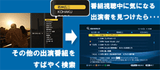 録画番組の再生中や放送の視聴中に気になる出演者やトピックを見つけたら、 該当する人名やキーワードを選択するだけで関連する番組を瞬時に検索して、 気になる番組を素早くかんたんに録画予約できる「気になる検索」。