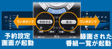 電源OFFの状態で「予約する」ボタンを押せば、予約設定画面が起動。 同じように「見る」ボタンを押せば、録画された番組の一覧画面が一発起動。 さらに、「番組表」ボタンなら番組表画面を表示、 「再生」ボタンなら前回途中まで見ていた番組の続きを再生、 「ホーム」ボタンならホームメニューを表示。操作の手間を省きます。