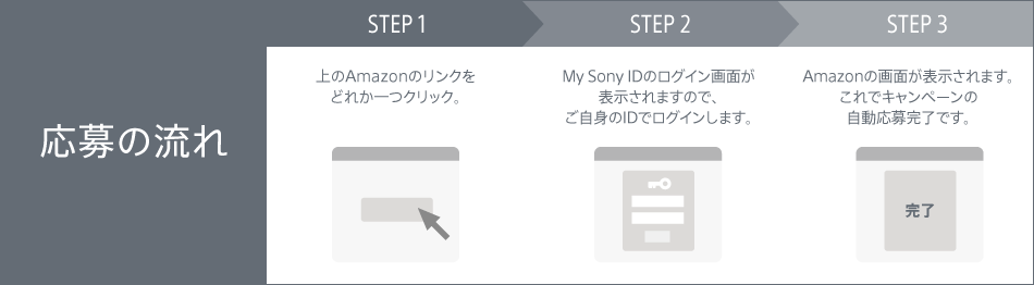本ページもしくはMy VAIO、Xperia(TM) TabletおすすめアプリのAmazon商品・バナーのリンクからMy Sony IDでログイン後、Amazonサイトを表示すると応募となります。