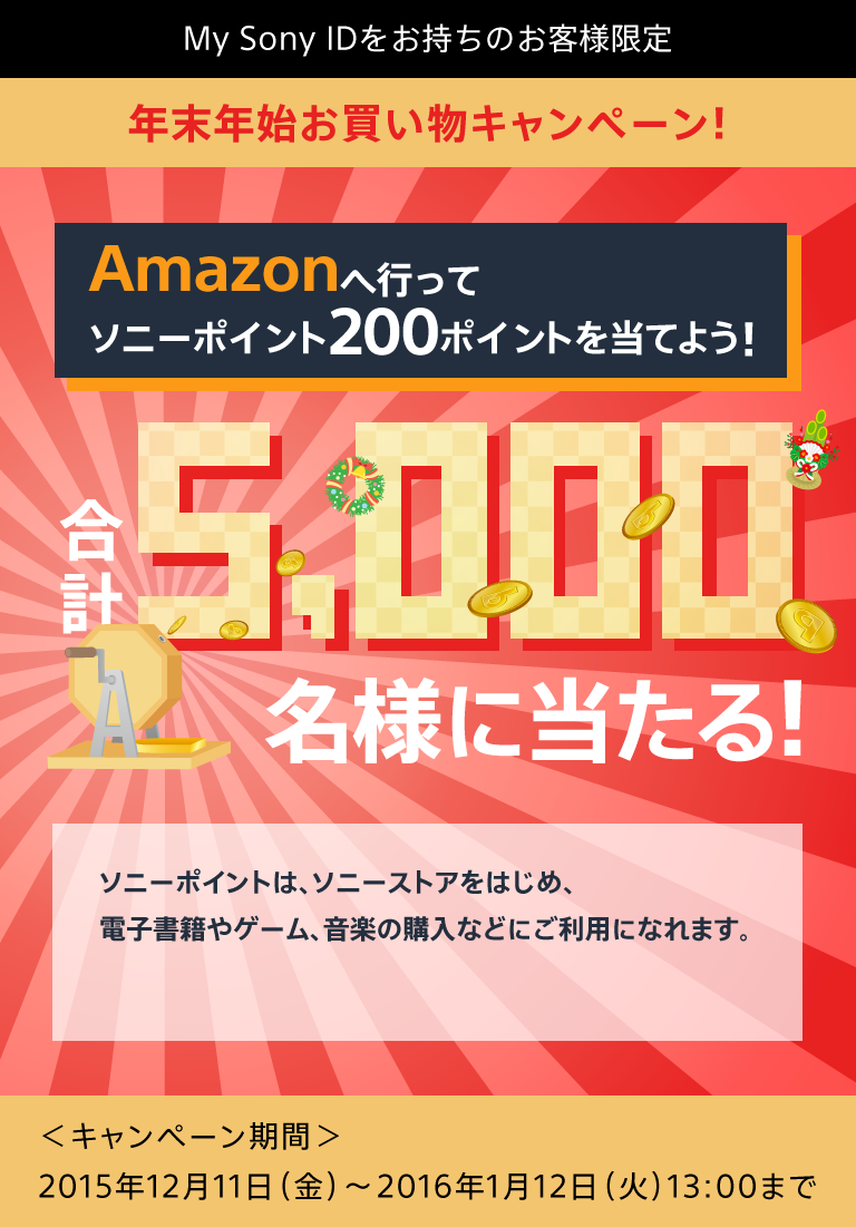 ・本キャンペーンはソニーマーケティング株式会社が主催するキャンペーンです。Amazonは、本サイトおよび本サイト上の商品・サービス、プログラムやキャンペーンのスポンサーではありません。