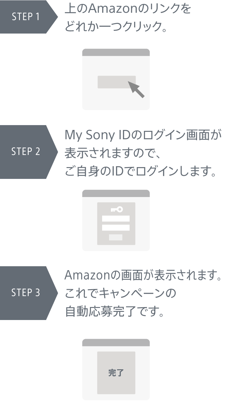 本ページもしくはMy VAIO、Xperia(TM) TabletおすすめアプリのAmazon商品・バナーのリンクからMy Sony IDでログイン後、Amazonサイトを表示すると応募となります。