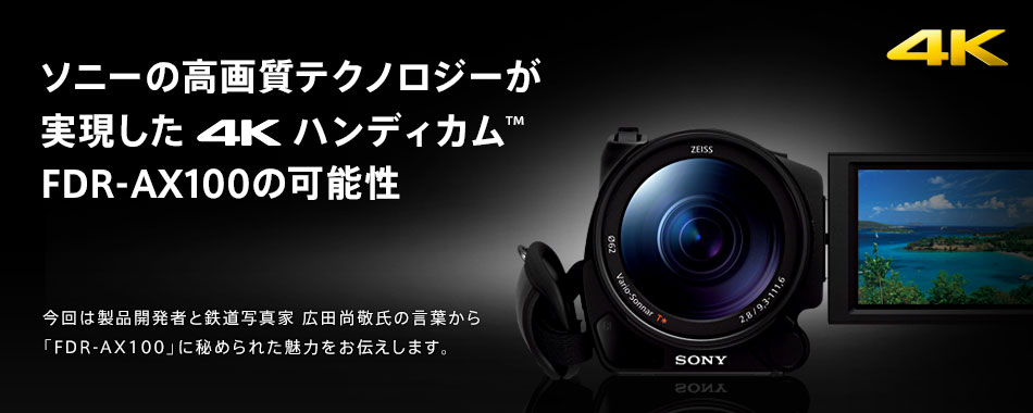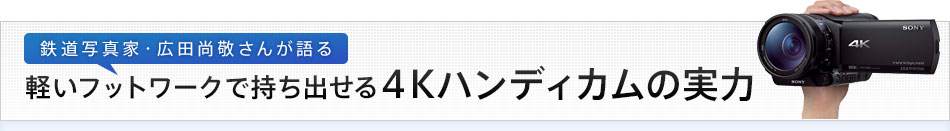 「FDR-AX100」は4Kでの表現力とともに、軽量・コンパクトで持ち運びやすさを追求しました。そこで気になるのは実際の撮影シーンでの使い勝手と画質。鉄道動画の撮影に造詣(ぞうけい)の深い、鉄道写真家の広田尚敬さんに、「FDR-AX100」を使用してのファーストインプレッションをお聞きしました。