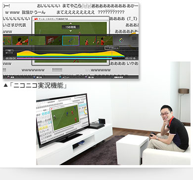 もうひとつは、「ニコニコ動画」のニワンゴが運営をおこなう「ニコニコ実況」との連携機能です。リアルタイムに発言が画面上を流れる“ニコ動風”のスタイルで、スポーツ中継の決定的なシーンでは画面上をコメントが埋め尽くす姿は圧巻。録画した番組でもコメントが流れるところも、まさに「ニコニコ動画」さながらです。