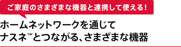 ナスネ™はTVチューナーとハードディスクを備えたネットワークレコーダー&メディアストレージです。テレビと接続して使用するブルーレイディスクレコーダーとは異なり、ナスネ™はホームネットワークに接続し、家のさまざまな場所にある機器へと映像を配信します。つまり、ホームネットワークにつながっている対応機器があれば、家のどこからでもテレビが見られるのです。