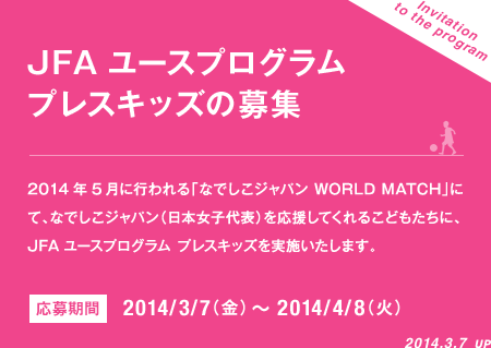2014年5月に行われる「なでしこジャパン WORLD MATCH」にて、なでしこジャパン(日本女子代表)を応援してくれるこどもたちに、JFAユースプログラム プレスキッズを実施いたします。