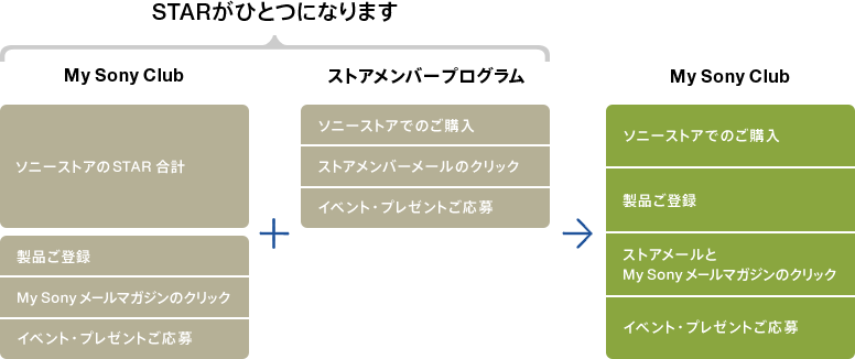 これまでMy Sony Clubと「ストアメンバープログラム」で、別々にご案内していたSTARがひとつになります。累計STAR数については、ソニーストアだけのSTAR数表示を廃止し、ソニーストアのSTARを含んだMy Sony ClubのSTAR数をご案内します。また、STAR明細もひとつのページですべての明細をご覧になれます。