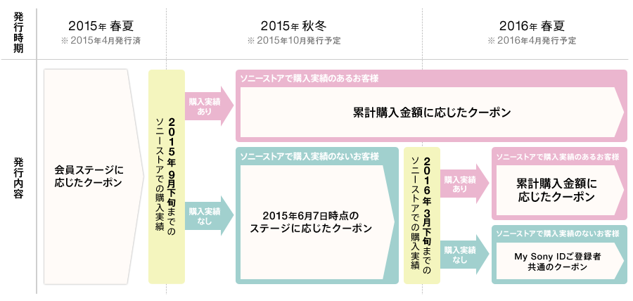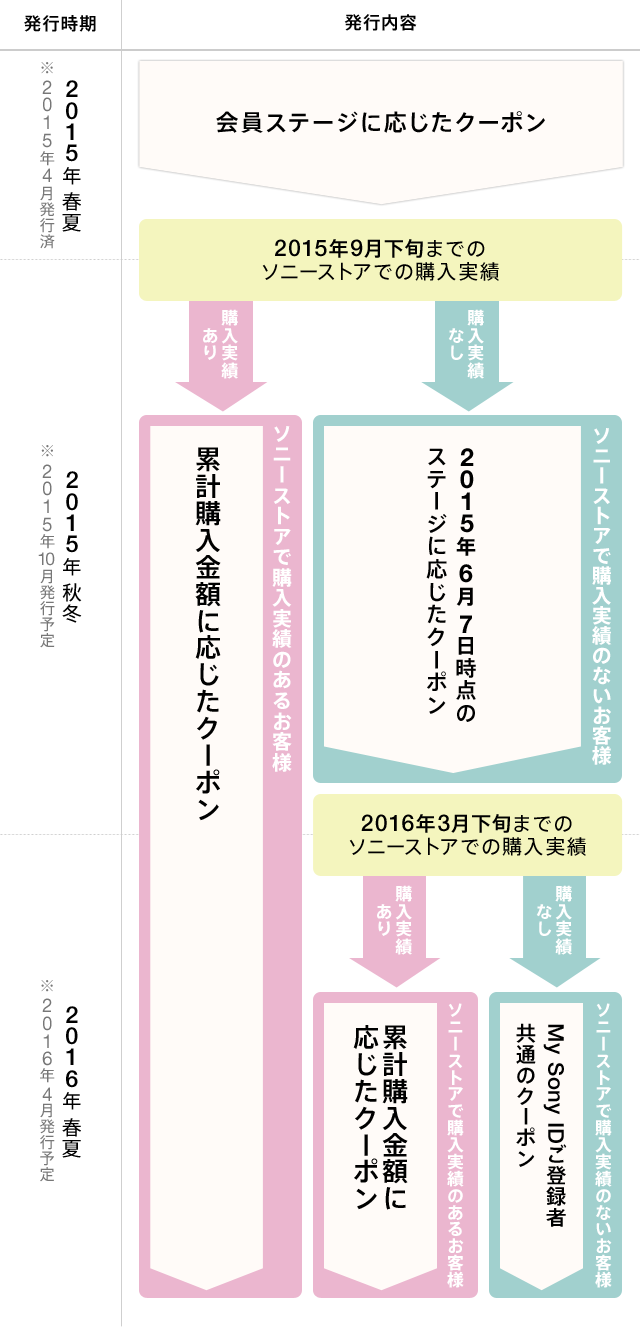 これまで会員ステージに応じて種類とご利用回数が異なるクーポンを発行していましたが、今後はソニーストアでの累計購入金額に応じてクーポンを発行いたします。なお、2015年9月下旬までにソニーストアでのご購入実績のないお客様におかれましては、2015年秋冬の定期クーポンは下記のとおり発行し、2016年春夏のクーポンよりソニーストアでの累計購入金額に応じたクーポンを発行いたします。