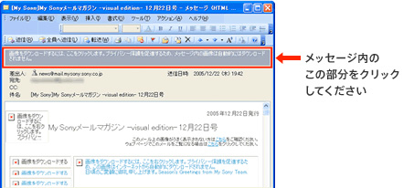 Windows XP Service pack2 OutlookExpressは、初期設定のままでは画像が表示されない場合があります。その場合は、右記の手順をお試しください。HTML形式のメールの場合、「Web ビーコン」と呼ばれる仕組みやクッキーを用いて、お客様のメール開封/プレビューの履歴などをメール配信元が知ることができます。My Sonyから配信されるメールでもWebビーコンを利用しております。ここで収集される情報の取り扱いに関しては ウェブサイトでの情報の取扱いについて をご確認ください。