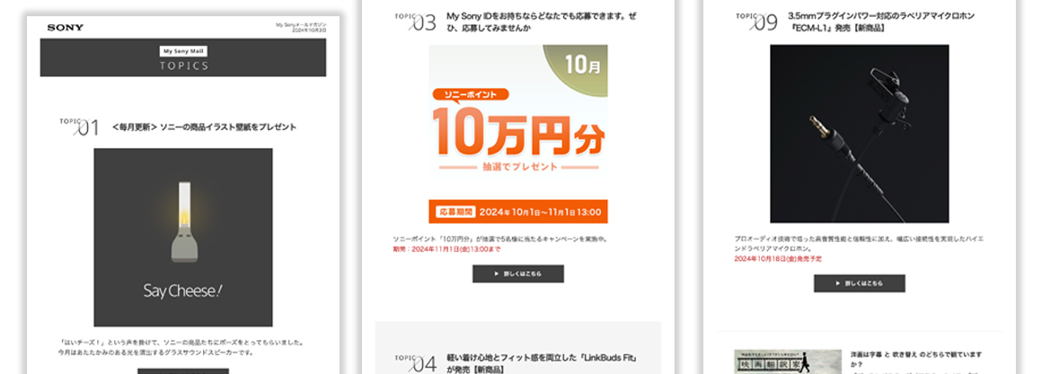 My Sony メールマガジンは、特集記事をはじめ、ソニーの新製品情報、キャンペーン・イベント情報、ソニーグループからの新着情報など、盛りだくさんでお届けするメールマガジンです。