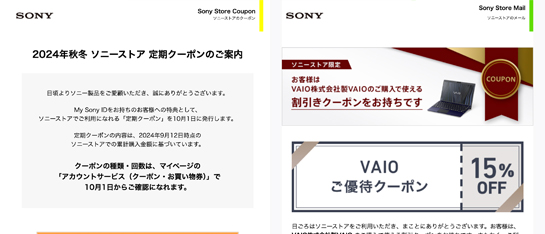 受信設定をしているお客様だけにお届けする、ソニーストアでご利用いただけるクーポンの情報や、期限切れ間近のクーポンについて随時お知らせします。