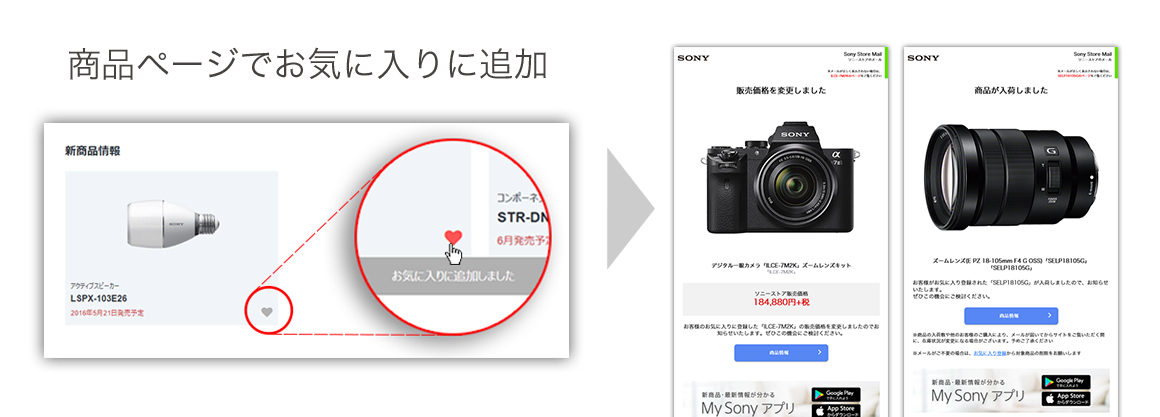 商品ページで気になった商品をお気に入りに追加すると、一部の商品について、ソニーストアでの入荷時期が未定の商品の再入荷(※)、販売価格変更をご案内します。