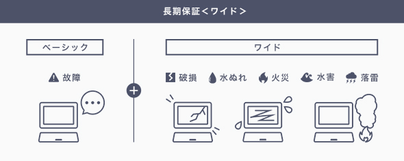 VAIOでは保証の範囲に合わせて<3年ワイド>、<3年ベーシック>がお選びいただけます。長期保証<3年ベーシック>は購入特典として無償付帯となります。長期保証<3年ワイド>なら、故障だけではなく、落下や水ぬれ、火災といった事故に対しても、無償で修理をうけることができます。