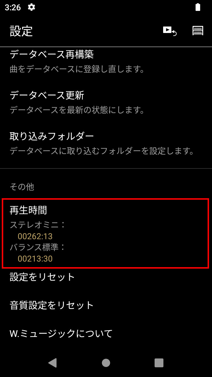 ※W.ミュージックアプリの設定画面で確認できる再生時間は、W.ミュージックアプリでの再生時間となります(W.ミュージックアプリ以外のアプリによる音楽再生時間はカウントされません)
