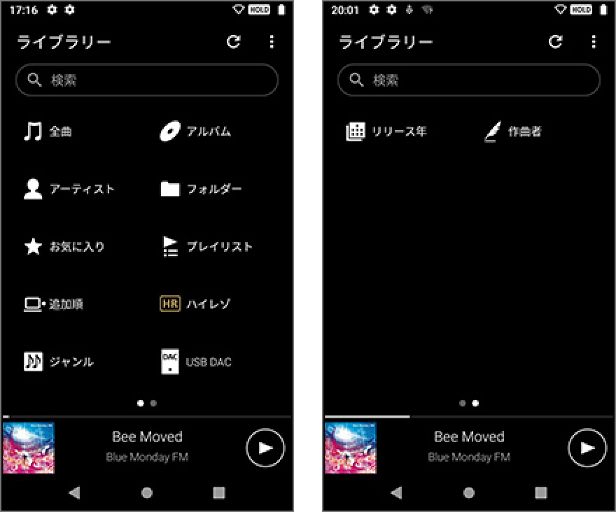 再生画面を中心に、上へ移動すると、ウォークマンの楽曲をさまざまな方法で検索できるメニューがあります。「全曲」「アルバム」「アーティスト」「フォルダー」「お気に入り」「プレイリスト」「追加順」「ハイレゾ」「ジャンル」「USB DAC」さらに右に移動すると、「リリース年」「作曲者」から、楽曲を選べます。