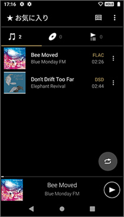 再生画面を中心に、右へ移動すると、お気に入りの曲が表示されます。よく聞く楽曲はお気に入りに追加して、聴きたい時すぐに再生できるようにしておくのがおすすめです。